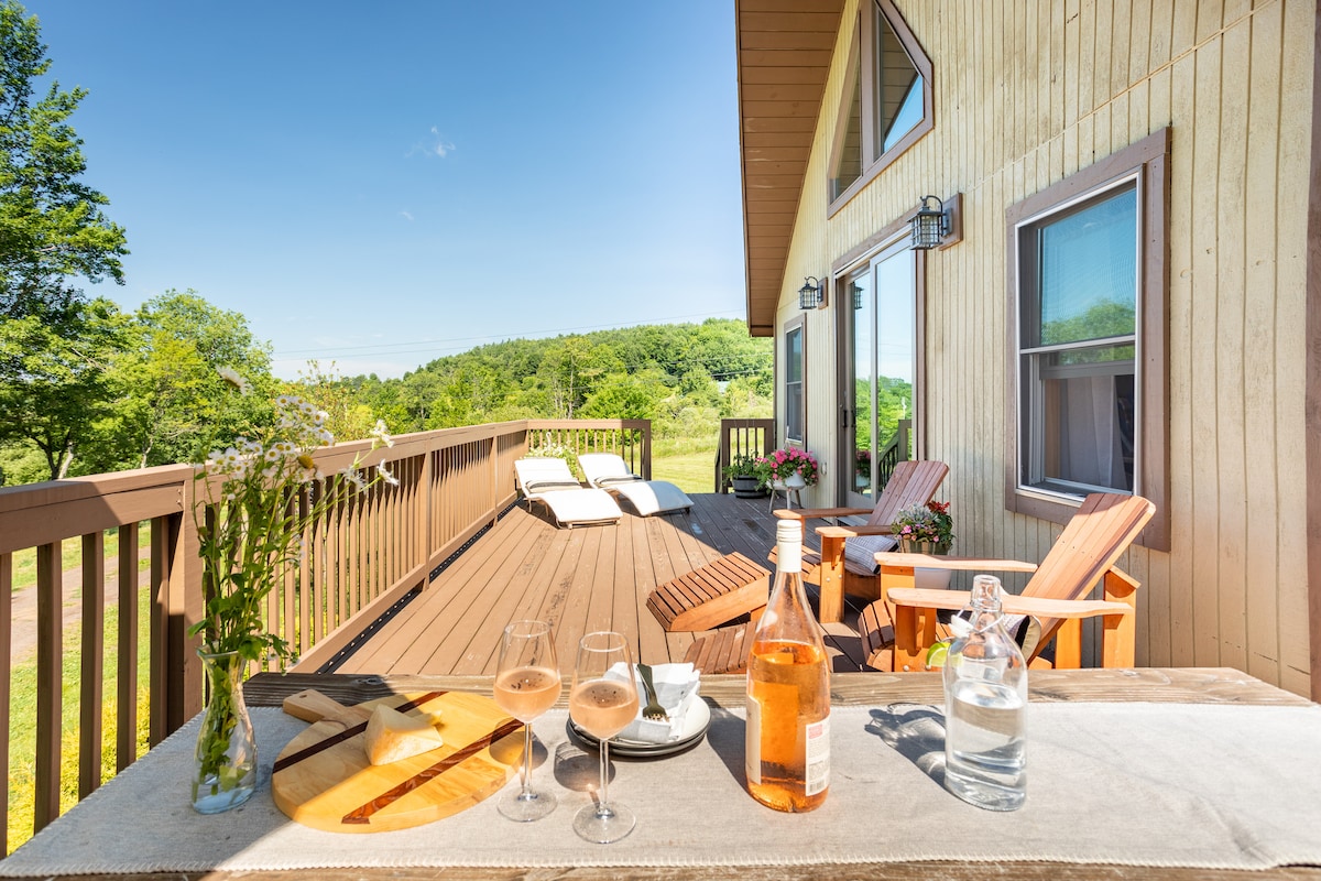Relax - Play - Enjoy! The best of two worlds: a sophisticated 2 Bedroom 2 Bath Contemporary with all the creature comforts - all this on just under 8 acres in a picturesque back country setting with majestic mountain views, and even a small pond. Plenty of highlights in the saltbox-like residence. Brand new stranded bamboo floors in the cathedral ceiling great room and bedrooms. Antique Blanco Granite counters, Hickory Cabinets, ceramic tiles floor in the kitchen, natural stone travertine tile floor in the downstairs bath. The upstairs Master Bedroom has ensuite bath with subway wall tiles and Art deco floor tiled shower and a closet with laundry hook-ups, both behind sliding barn doors. All the mechanicals, appliances, fixtures are new (2018/2019) and above average including thoughtful details oriented to todays lifestyle (USB charging ports in electrical outlets in bedrooms!). All this just minutes from Ski Plattekill in Roxbury, the Round Barn Farmer's Market in Margaretville and within 3hrs. from GWB. All the amenities of home Wi-Fi Direct TV. House has all New finishes from pillows, bed sheets, mattress all the way down to perfectly rolled white towels, always find a relief of cleanliness with a little touch of OCD.